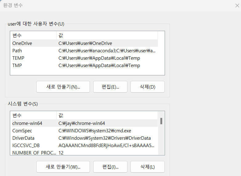 편집 창에서 "새로 만들기"를 클릭하고 복사한 크롬 드라이버 경로를 붙여 넣기