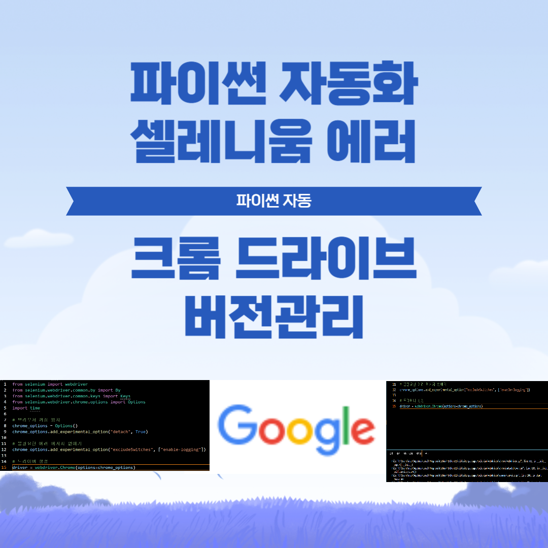 가장 큰 문제는 셀레니움 실행과 관련하여 크롬 드라이버 관련 오류가 다양하게 발생한다는 것입니다. 자주 발생하는 오류 유형별로 해결 책을 알아 보겠습니다.