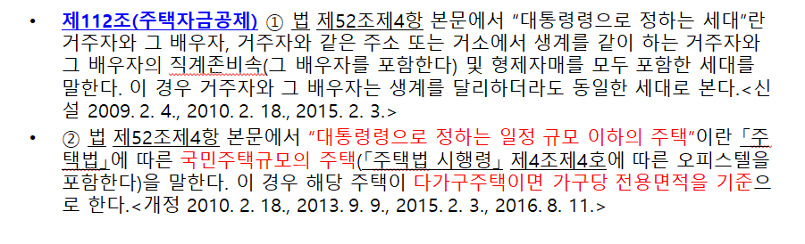 | ①법 제20조에 따른 근로소득에는 다음 각 호의 소득이 포함되는 것으로 한다. 6. 주택을 제공받음으로써 얻는 이익 7. 종업원이 주택(주택에 부수된 토지를 포함한다)의 구입ㆍ임차에 소요되는 자금을 저리 또는 무상으로 대여 받음으로써 얻는 이익 |